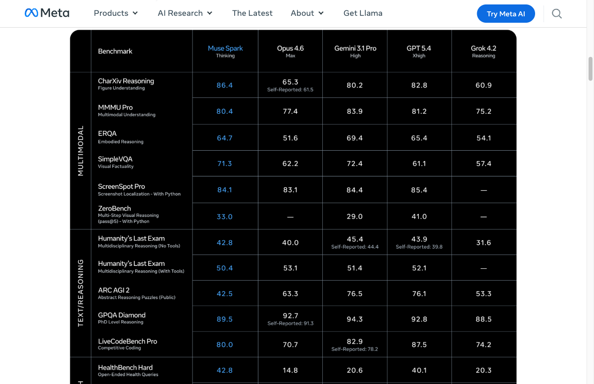 각 모델의 특화 영역은 뚜렷합니다. Gemini 3.1 Pro는 2M 컨텍스트와 GPQA 94.3%의 과학적 추론, Claude Opus 4.6은 코딩과 SWE-bench, GPT-5.4는 전반적 범용성, 그리고 Muse Spark은 의료/건강(HealthBench Hard 1위)과 시각 이해(Figure Understanding 2위)에서 두각을 나타냅니다.